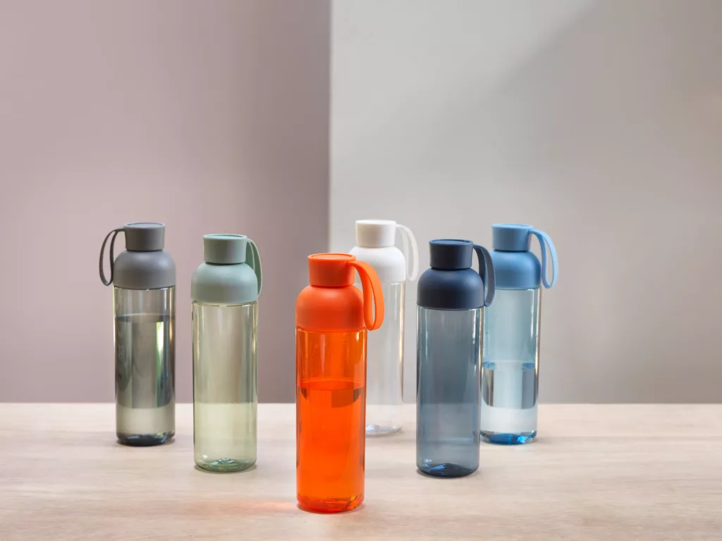 Bouteille d’eau Illuminate de 600 ml en RPET, fabriquée à partir de 89,5% de plastique recyclé et disposant d’une poignée en silicone confortable.